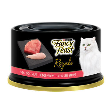FANCY FEAST® Adult Royale Seafood Platter topped with Chicken Strips Wet Cat Food is a highly palatable wet cat food made for occasional or supplemental feeding. This flavour delivers a unique Fancy Feast taste experience of crustaceans of the ocean topped with chicken strips and glazed in delicious silky broth. This food is part of the Fancy Feast Royale Range, which consists of an extensive array of tasty, mouth-watering flavours. With so many gourmet flavours and textures, even the most fussy eaters will find satisfaction. This highly palatable broth is made with assorted seafood in a rich broth topped with delicious chicken strips to make a delicious treat that your cat will devour.